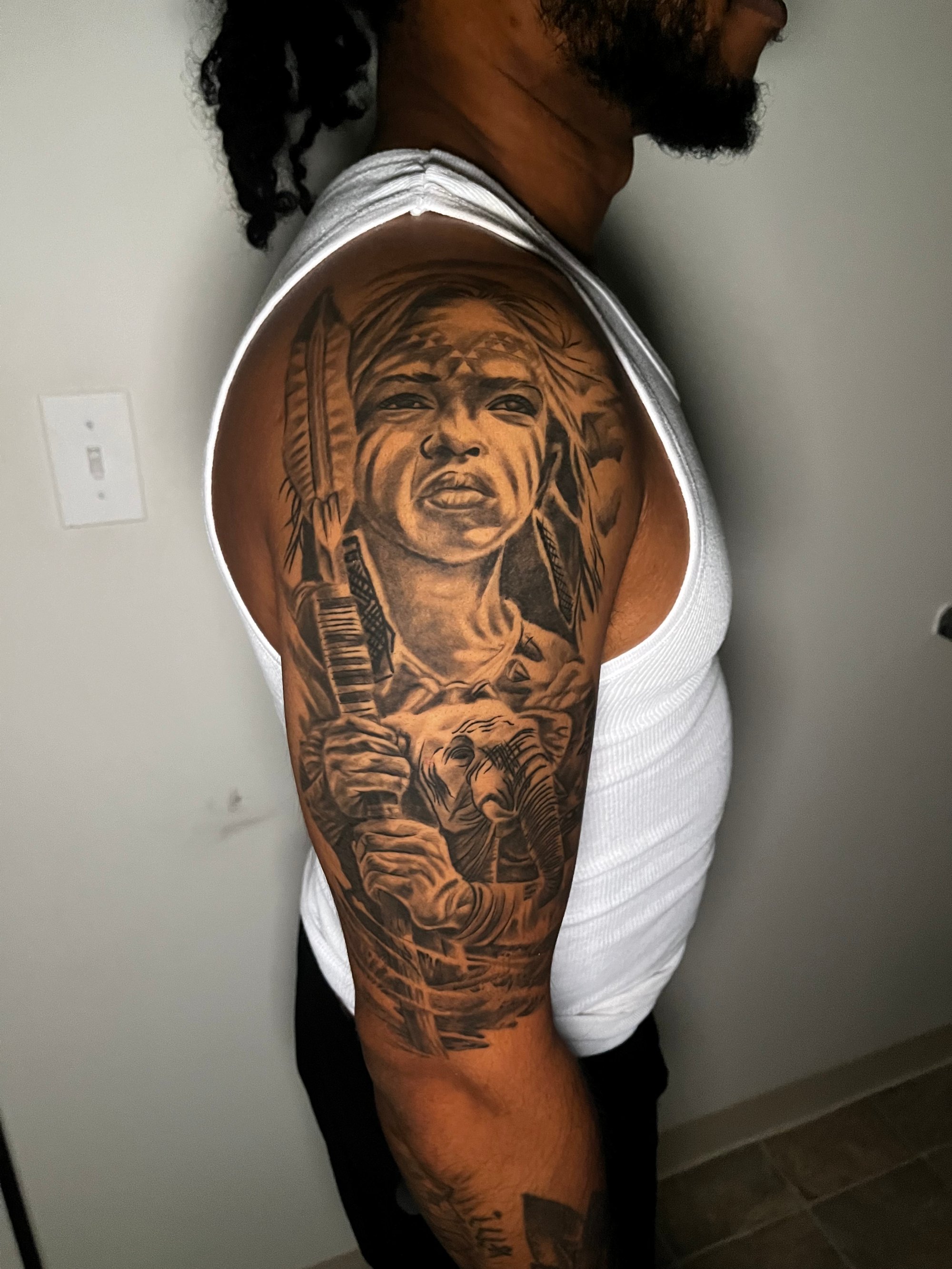 Black and gray quarters sleeves depending on the complexity of the design can range anywhere from 4-6 hours ( $400 - $600) Example of quarter sleeve is from top of shoulder to elbow outer arm or inner arm.